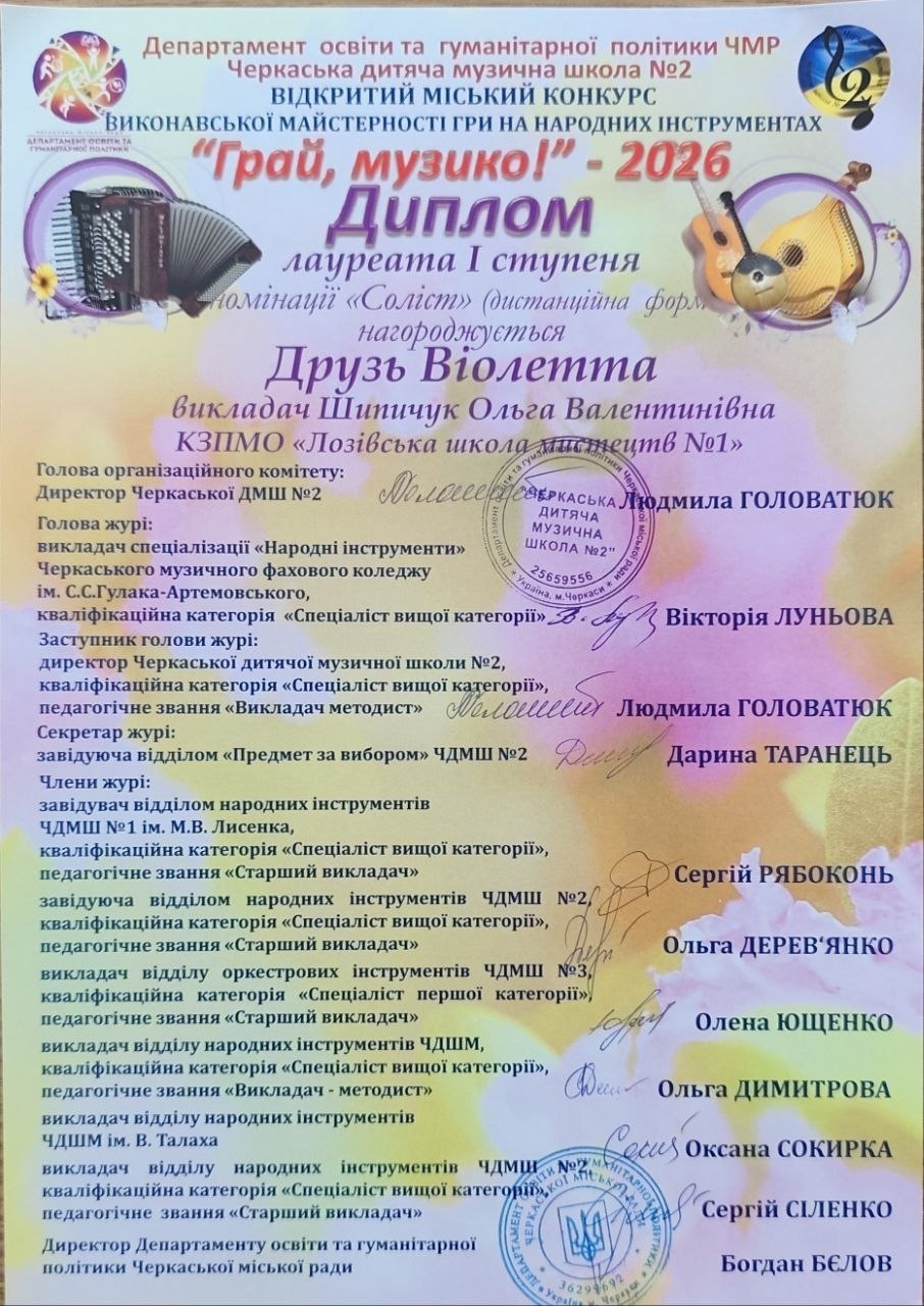 🎶 Друзь Віолетта – Лауреат І ступеня (викладач Ольга Шипичук)