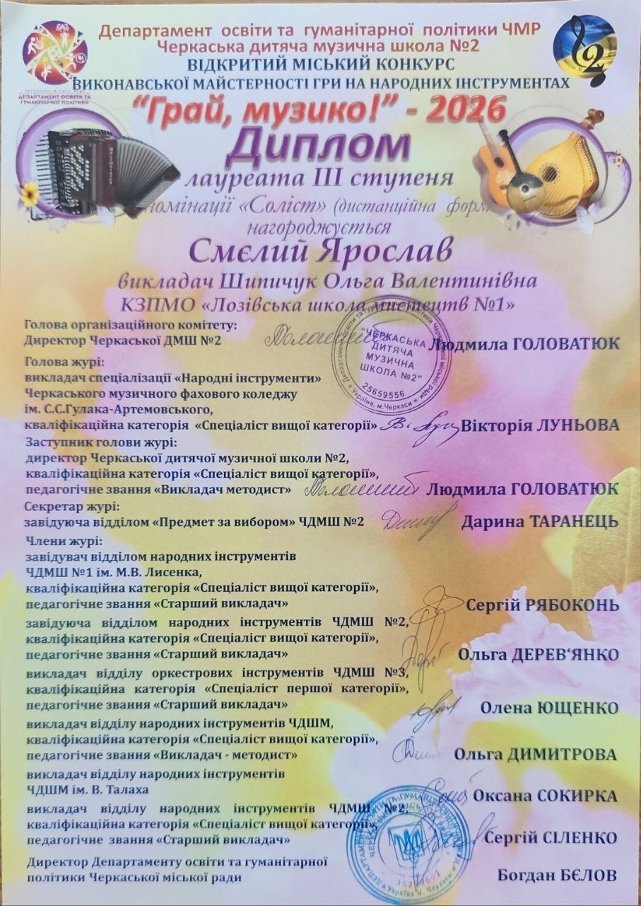 🎶 Смєлий Ярослав – Лауреат ІІІ ступеня (викладач Ольга Шипичук)