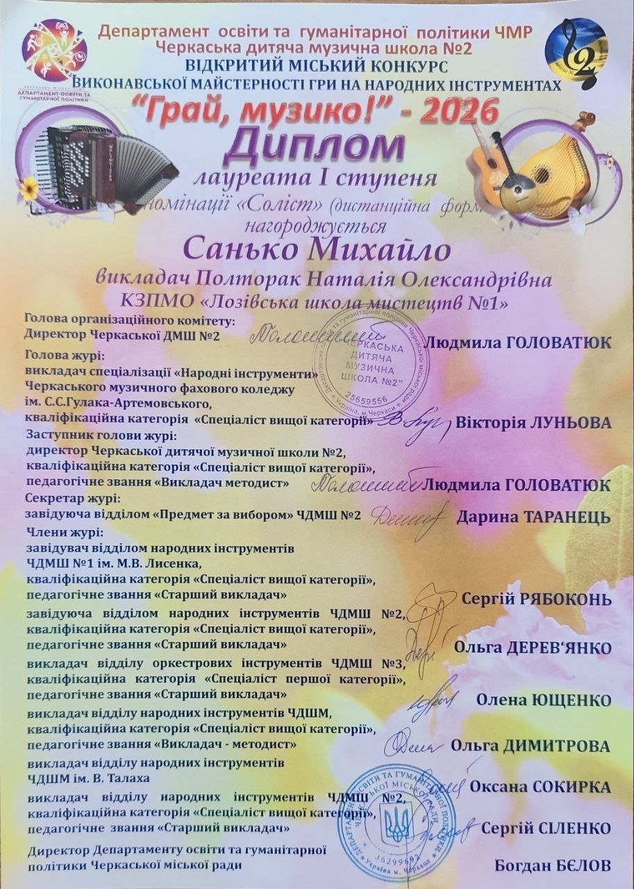 🎶 Санько Михайло – Лауреат І ступеня (викладач Наталія Полторак)
