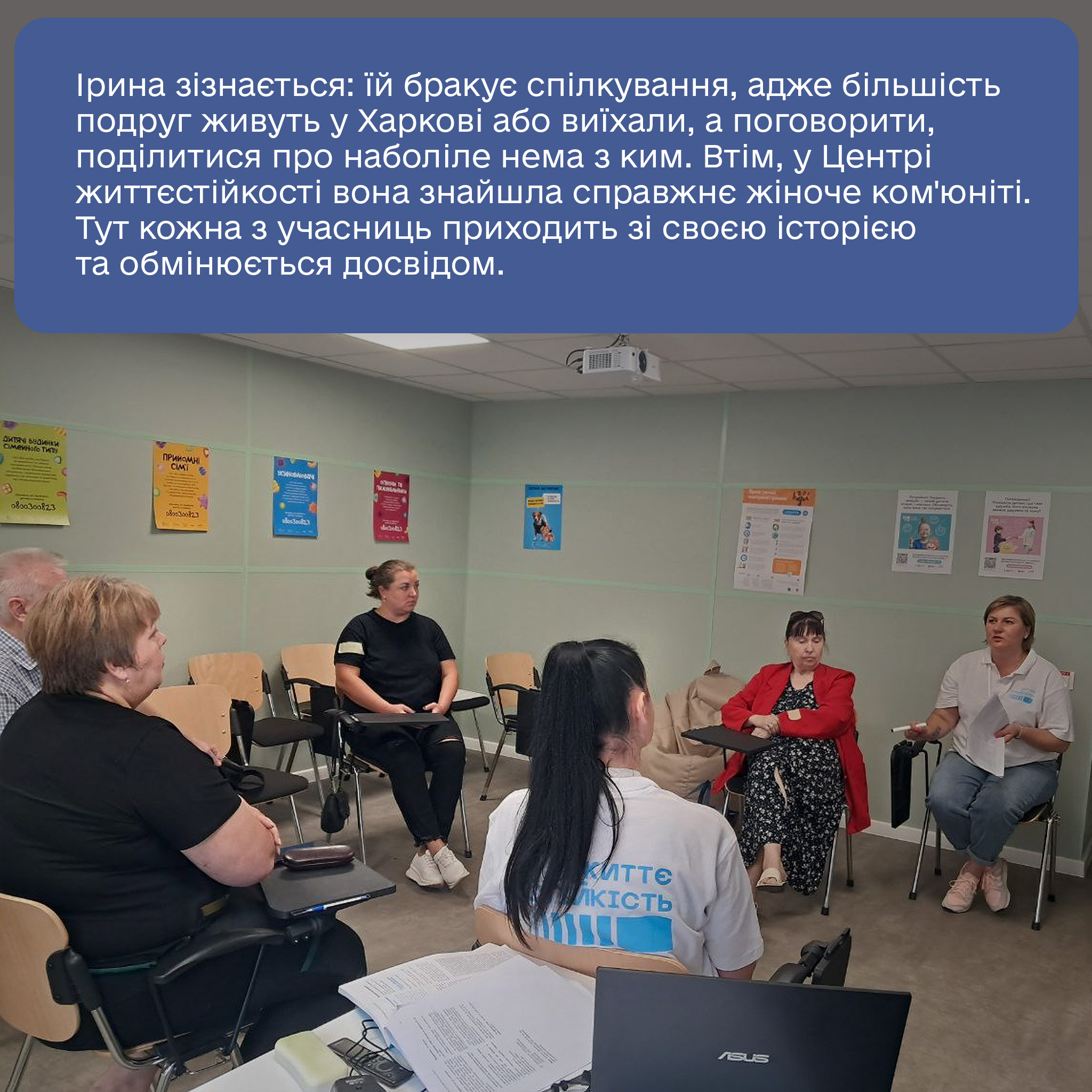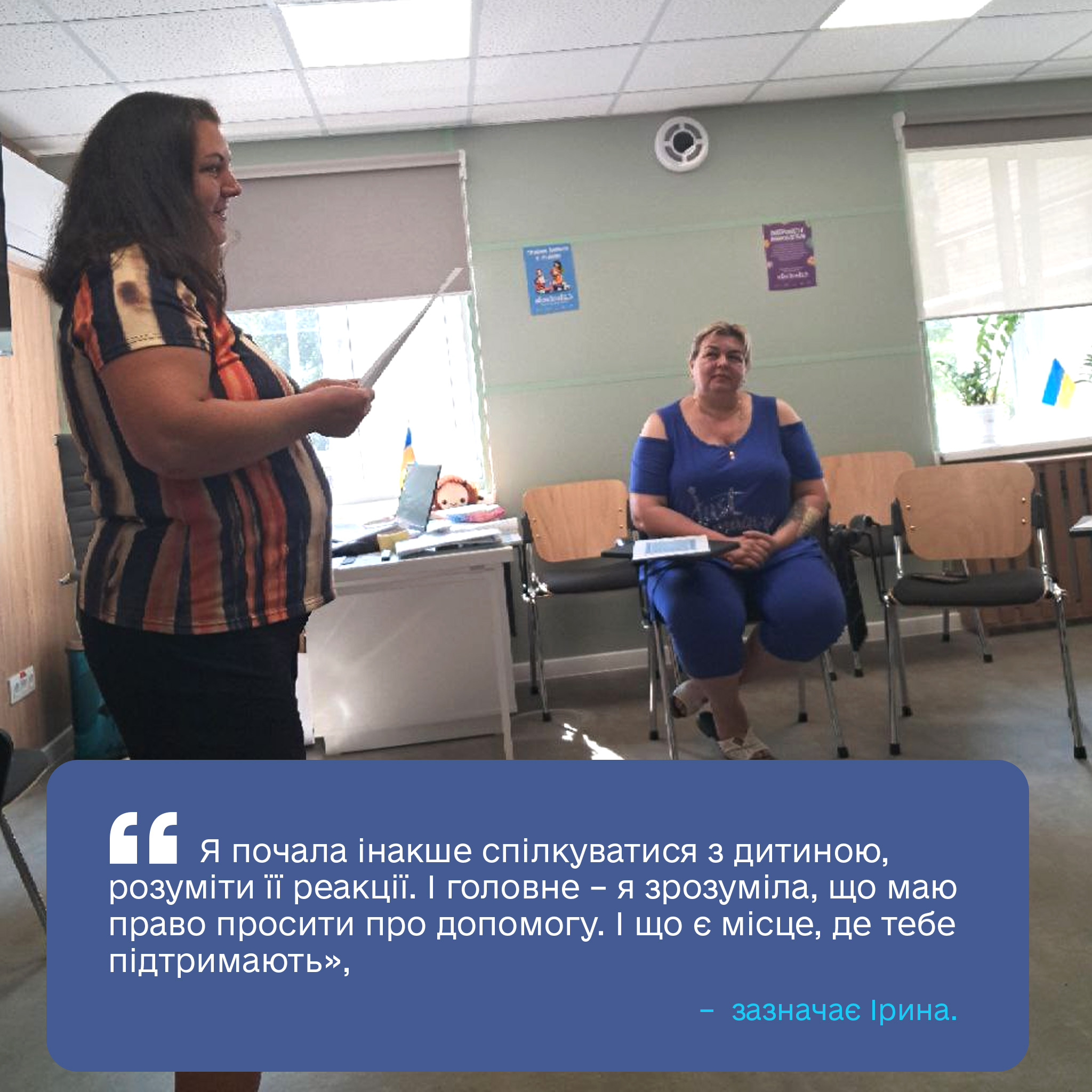 Ірина стала однією з перших учасниць тренінгу «Батьківство без стресу» у Центрі життєстійкості Лозівської громади. Спочатку в групі було всього четверо. За спостереженнями жінки, учасників було мало, бо багато людей бояться звернутися по психологічну допомогу.