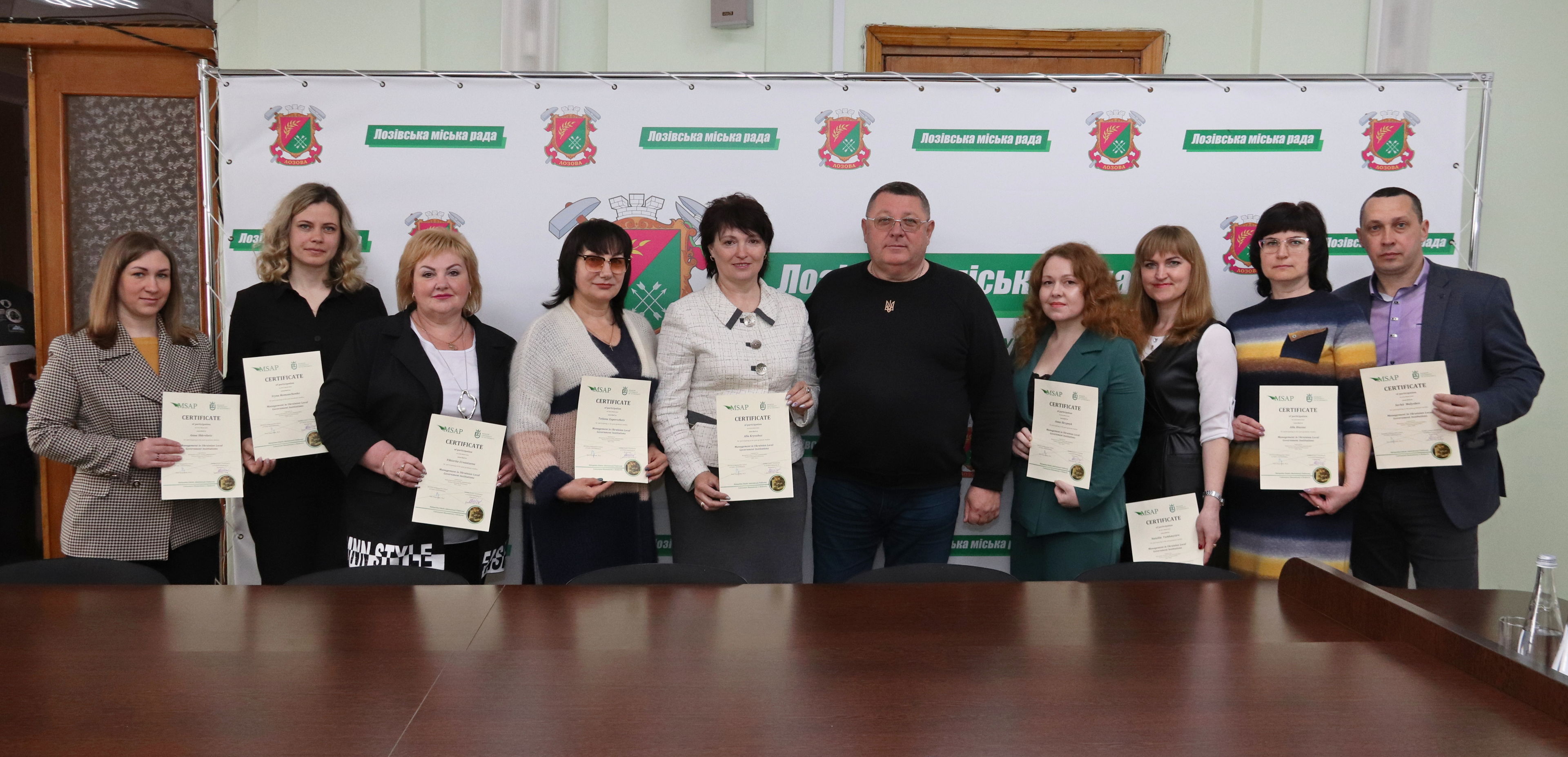 Незважаючи на військовий час, слухачі захистили дипломні роботи та отримали сертифікати міжнародного зразка. Вручив їх десяти фахівцям виконавчого комітету, управлінь та комунальних підприємств міської ради Лозівський міський голова Сергій Зеленський.