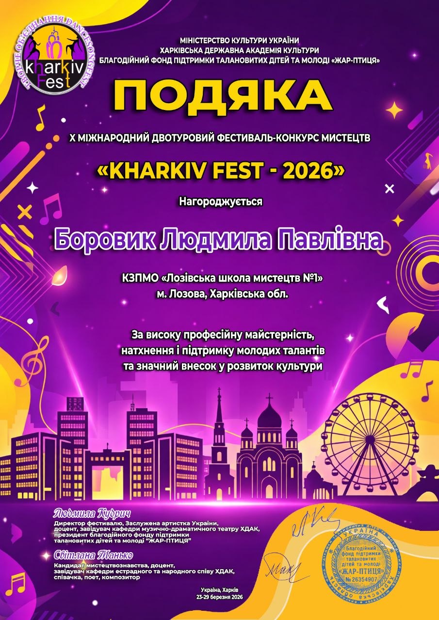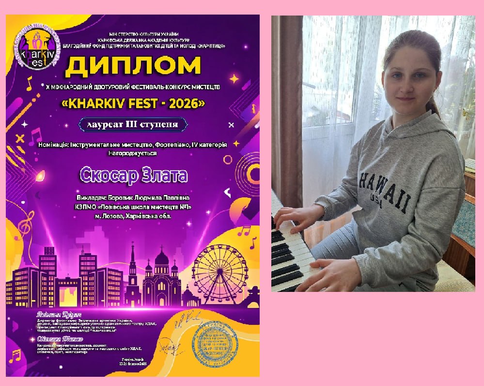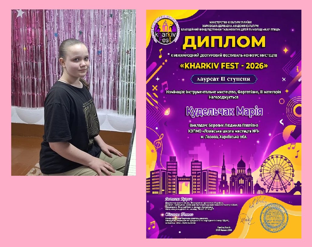 Талановиті піаністки «Лозівської школи мистецтв №1» Кудельчак Марія та Скосар Злата стали Лауреатами Х Міжнародного двотурового фестивалю-конкурсу мистецтв «Kharkiv Fest-2026». Наші вихованки вкотре продемонстрували справжню майстерність та творчий дух. Окрему вдячність висловлюємо їх викладачеві Людмилі Боровик за підготовку до конкурсу та вагомий внесок у виховання творчої молоді! Далі – тільки вперед!