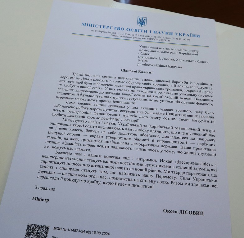 Лозівська громада отримала подяку Міністра освіти й науки за організацію та проведення національного мультипредметного тестування