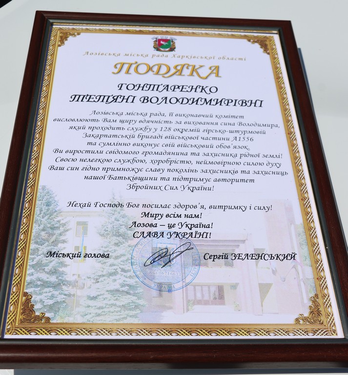 Лозівський міський голова Сергій Зеленський подякував матері захисника – Тетяні Володимирівні за сина, який з честю й гідністю боронить рідну землю у лавах Збройних Сил України.