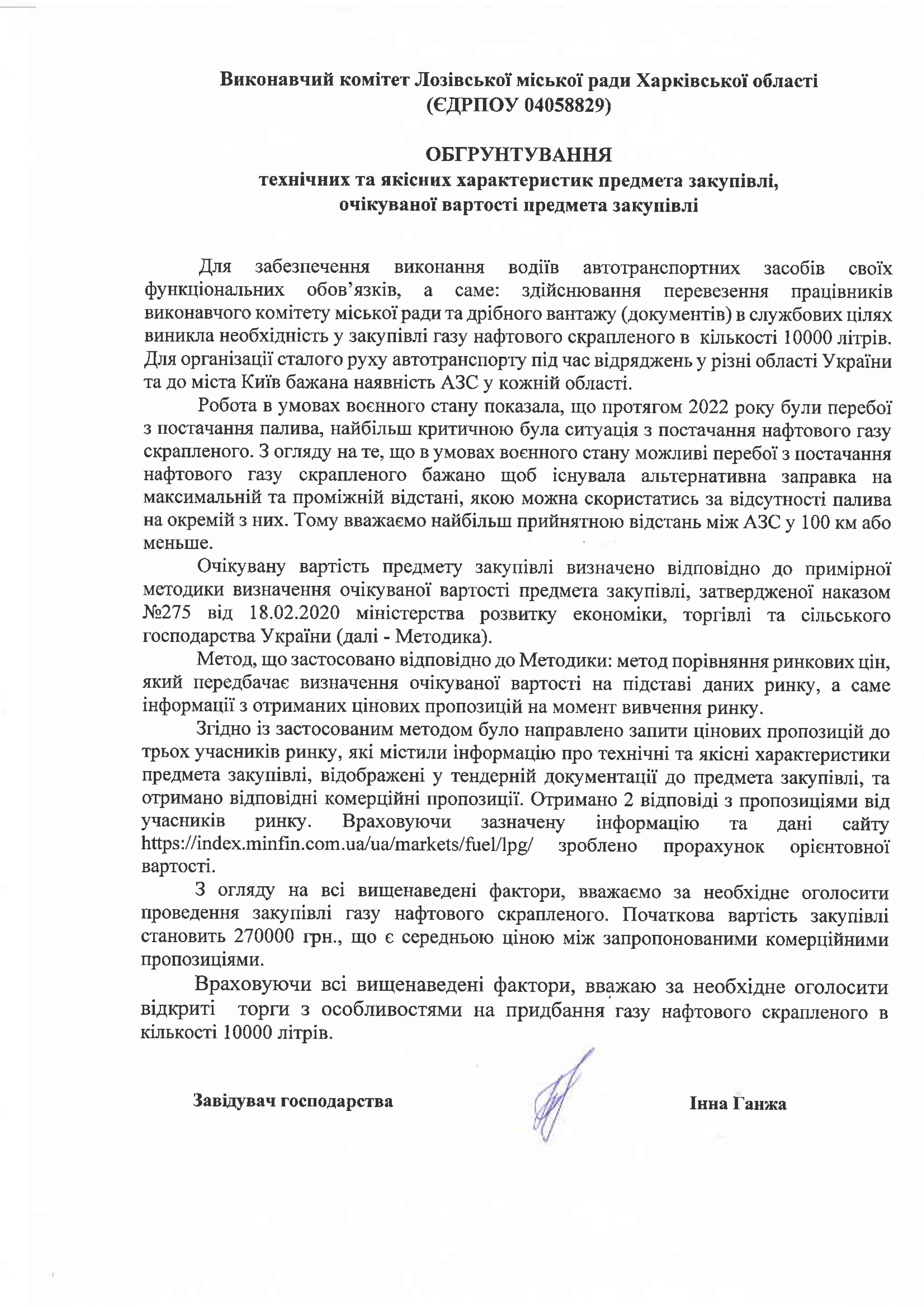 Обгрунтування технічних та якісних характеристик предмета закупівлі, очікуваної вартості предмета закупівлі (газ нафтовий скраплений)