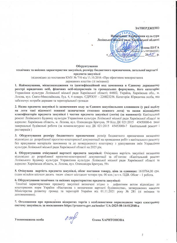 Обґрунтування технічних та якісних характеристик предмета закупівлі, очікуваної вартості предмета закупівлі виконавчого комітету Лозівської міської ради Харківської області (ЄДРПОУ 04058829)