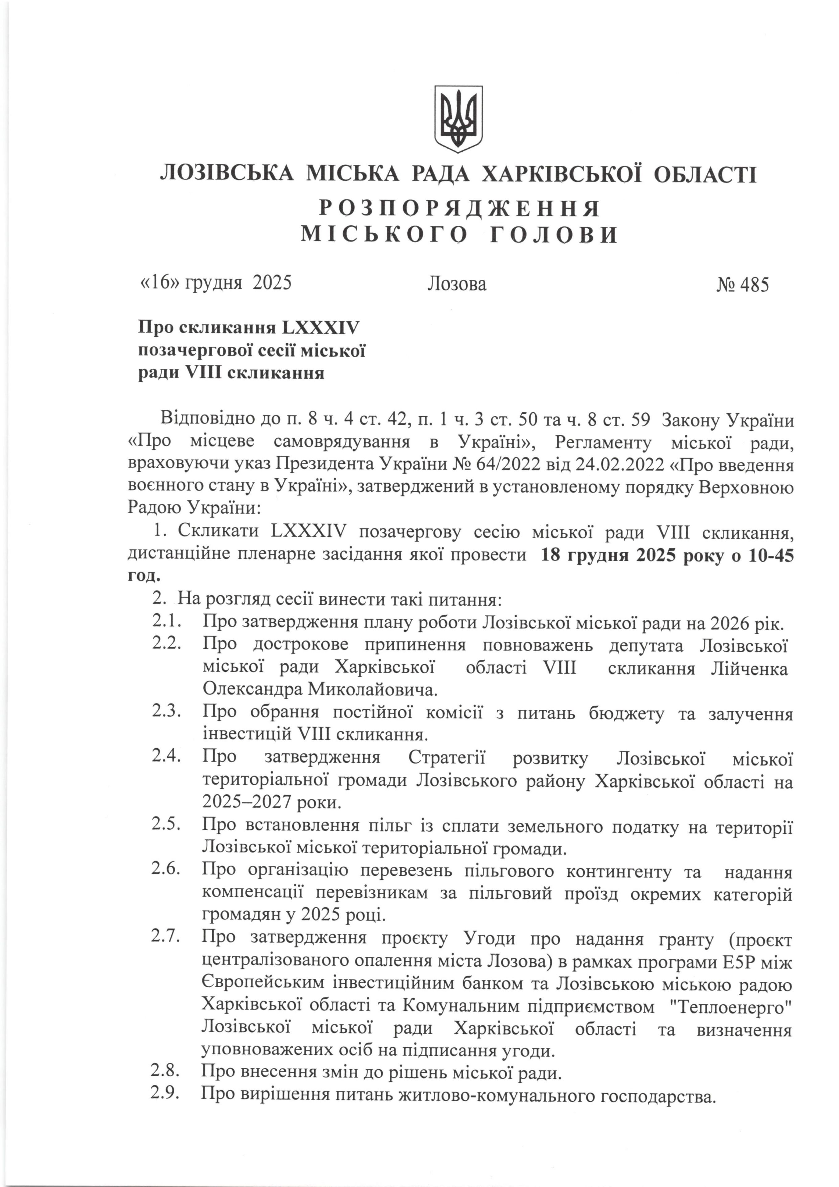 Про скликання LXХХІV позачергової сесії міської ради VІІІ скликання