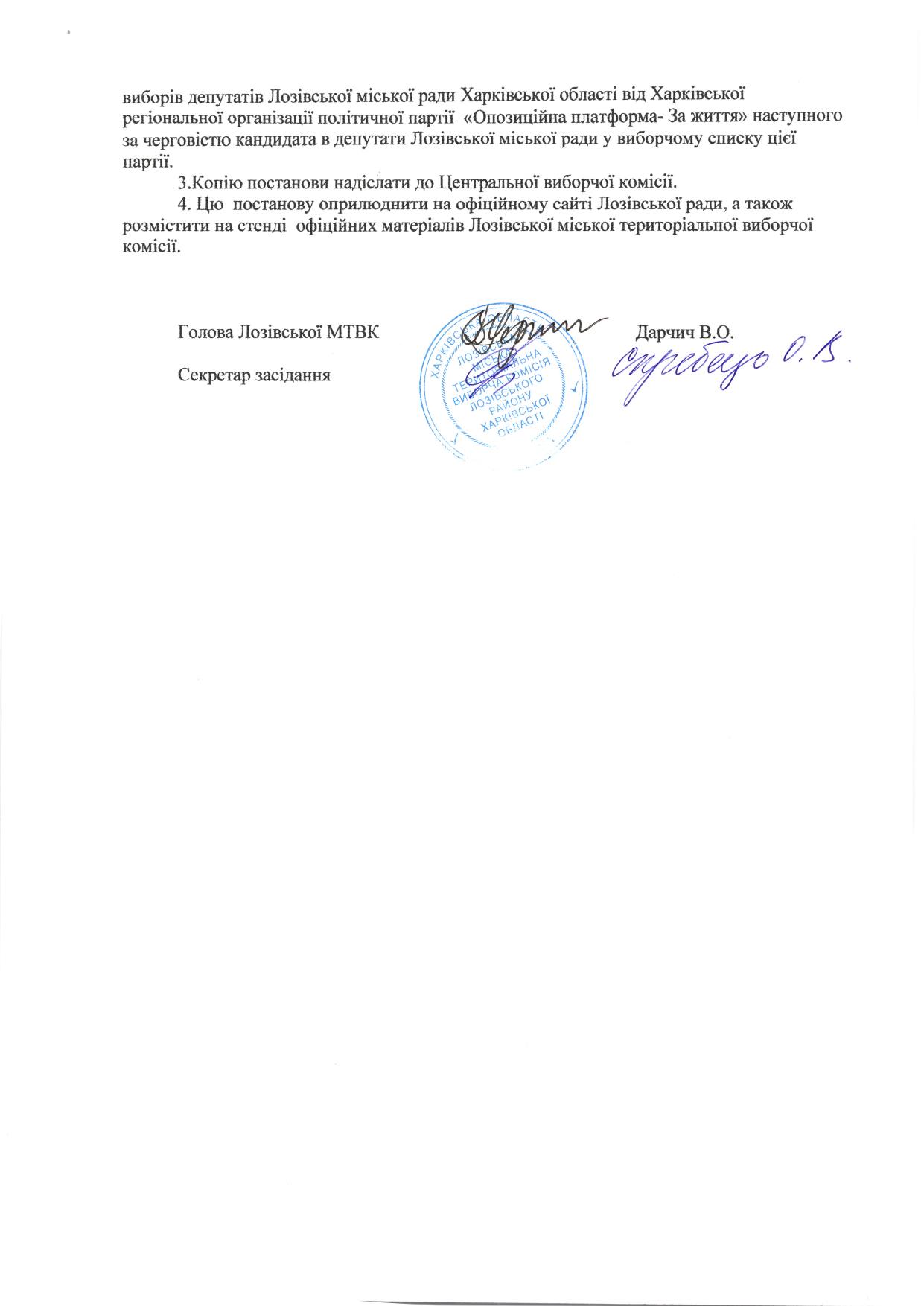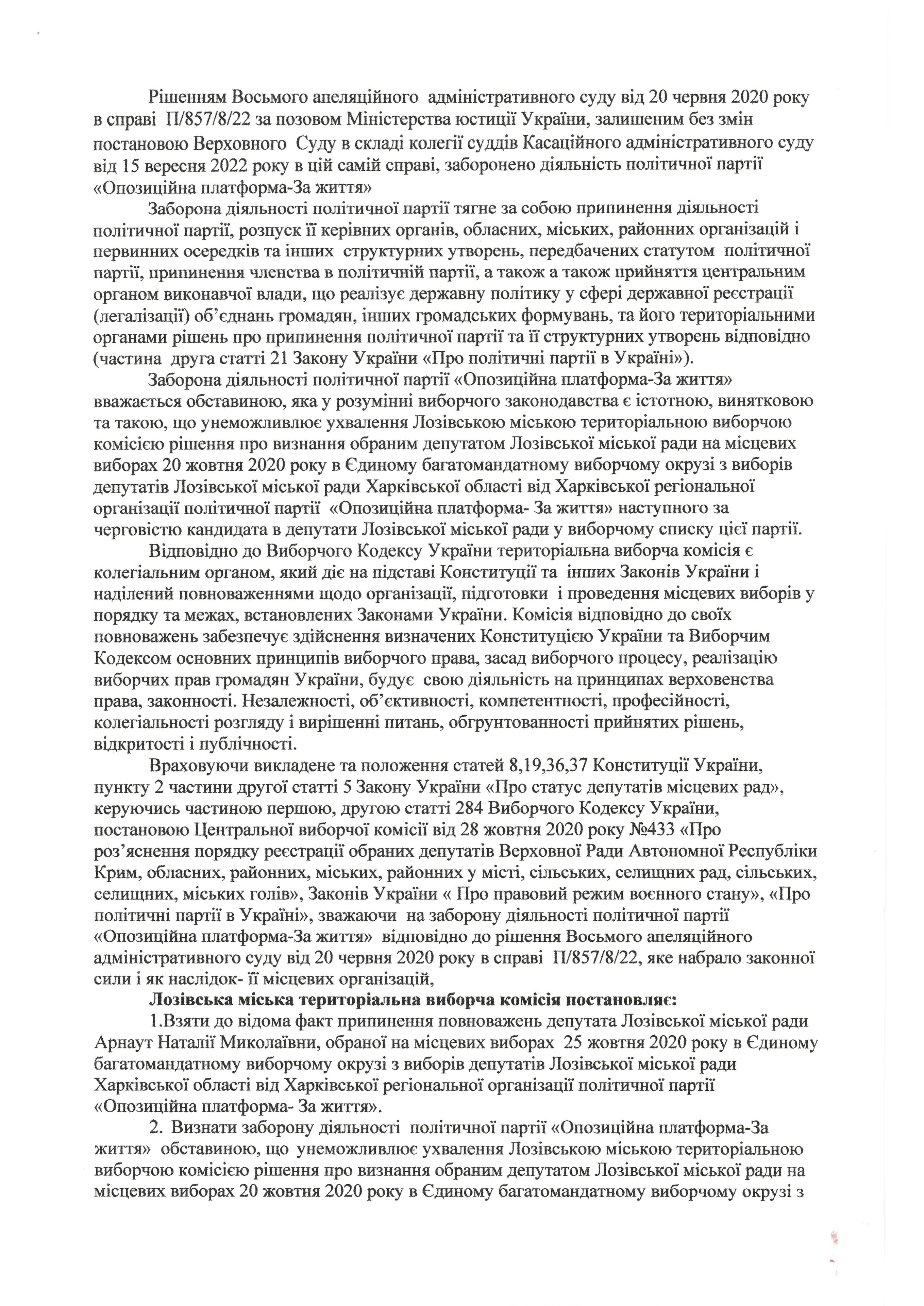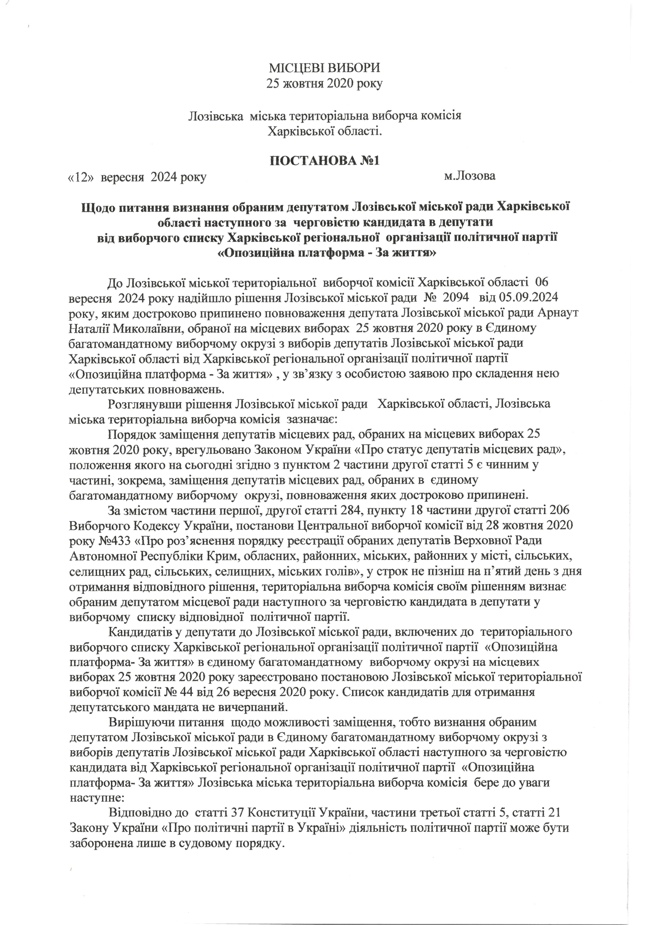 Щодо питання визнання обраним депутатом Лозівської міської ради Харківської області наступного за черговістю кандидата в депутати від виборчого списку Харківської регіональної організації політичної партії «Опозиційна платформа - За життя»