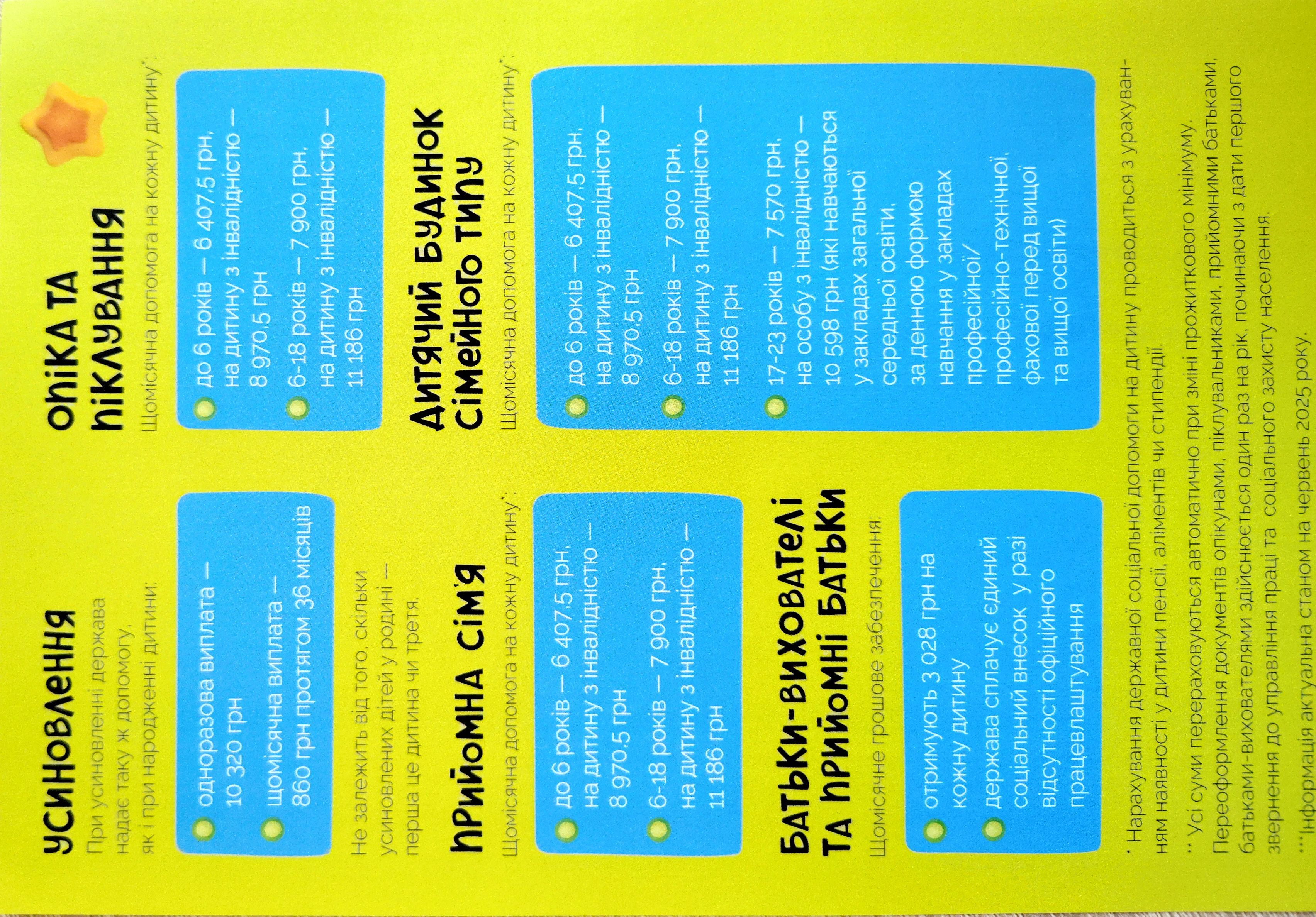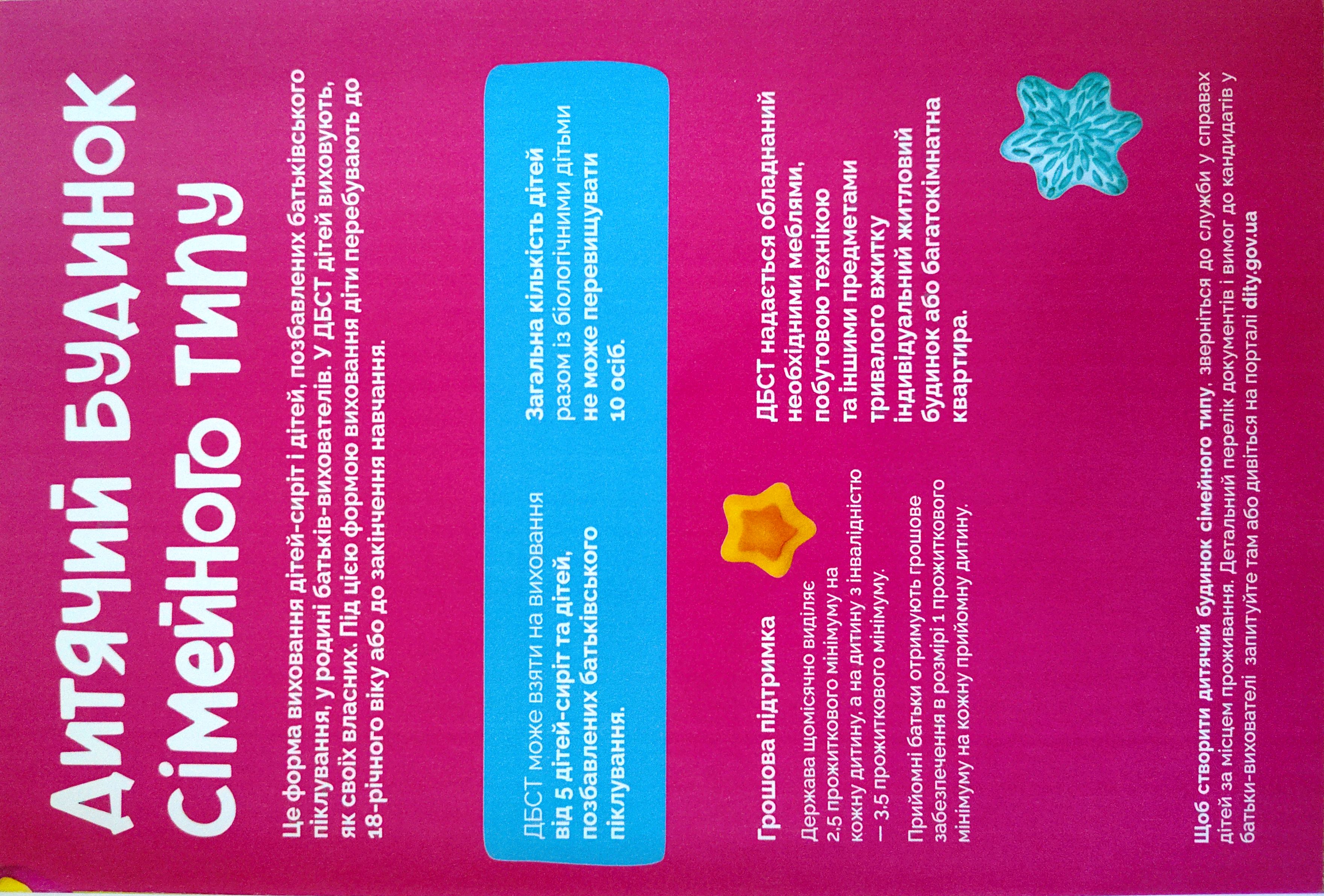 Грошова підтримка: держава щомісячно виділяє 2,5 прожиткового мінімуму на кожну дитину, а на дитину з інвалідністю 3,5 прожиткового мінімуму.