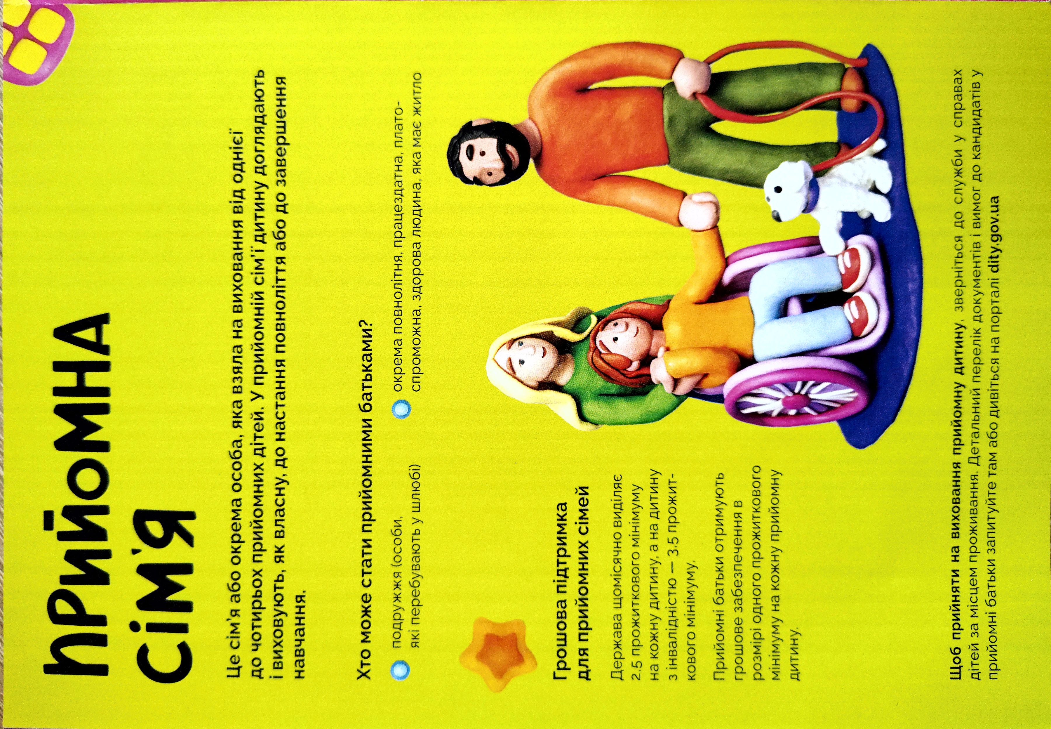 3. Прийомна сім’я - добровільне прийняття до сім'ї або окремою особою від однієї до чотирьох дітей на виховання та спільне проживання. За дитиною зберігаються всі державні пільги та гарантії.