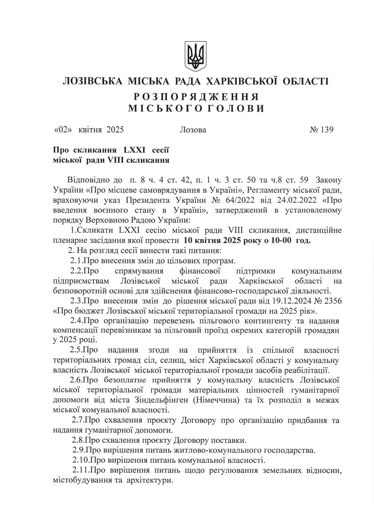Оголошення про скликання LХХIХ сесії міської ради VIII скликання