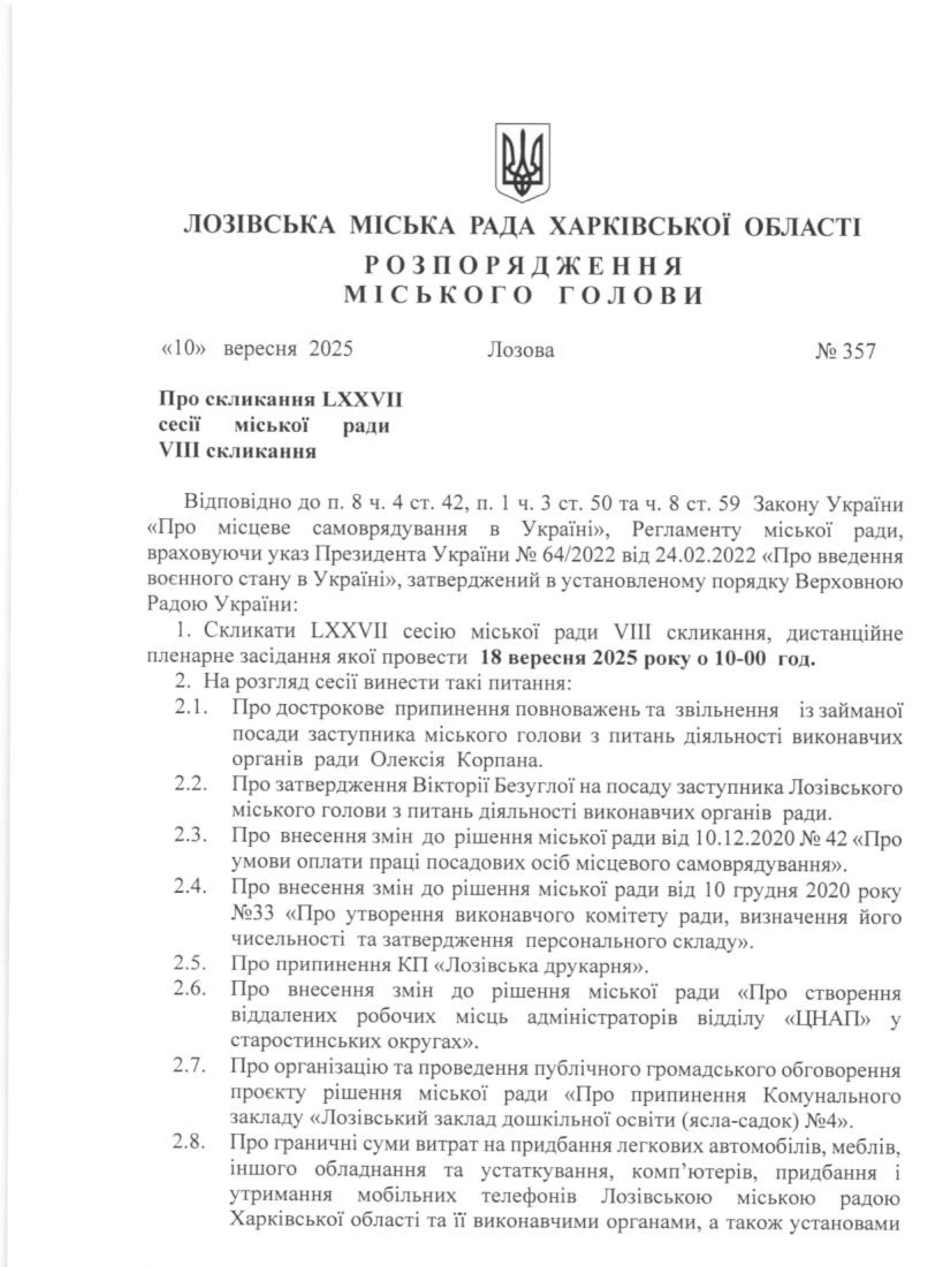Скликання LХХVII сесії міської ради VIII скликання