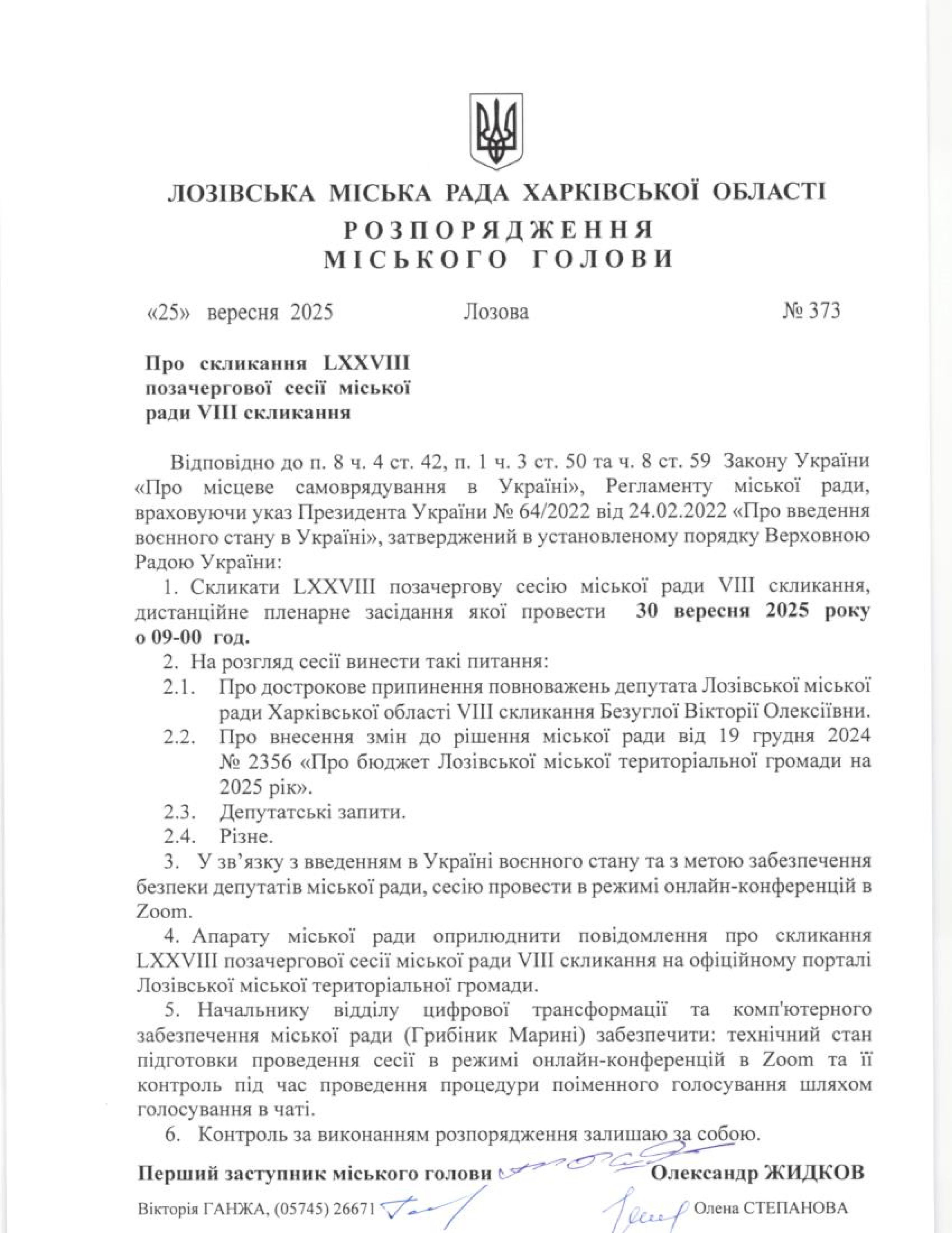 Скликання LXІІ позачергової сесії міської ради VIII скликання