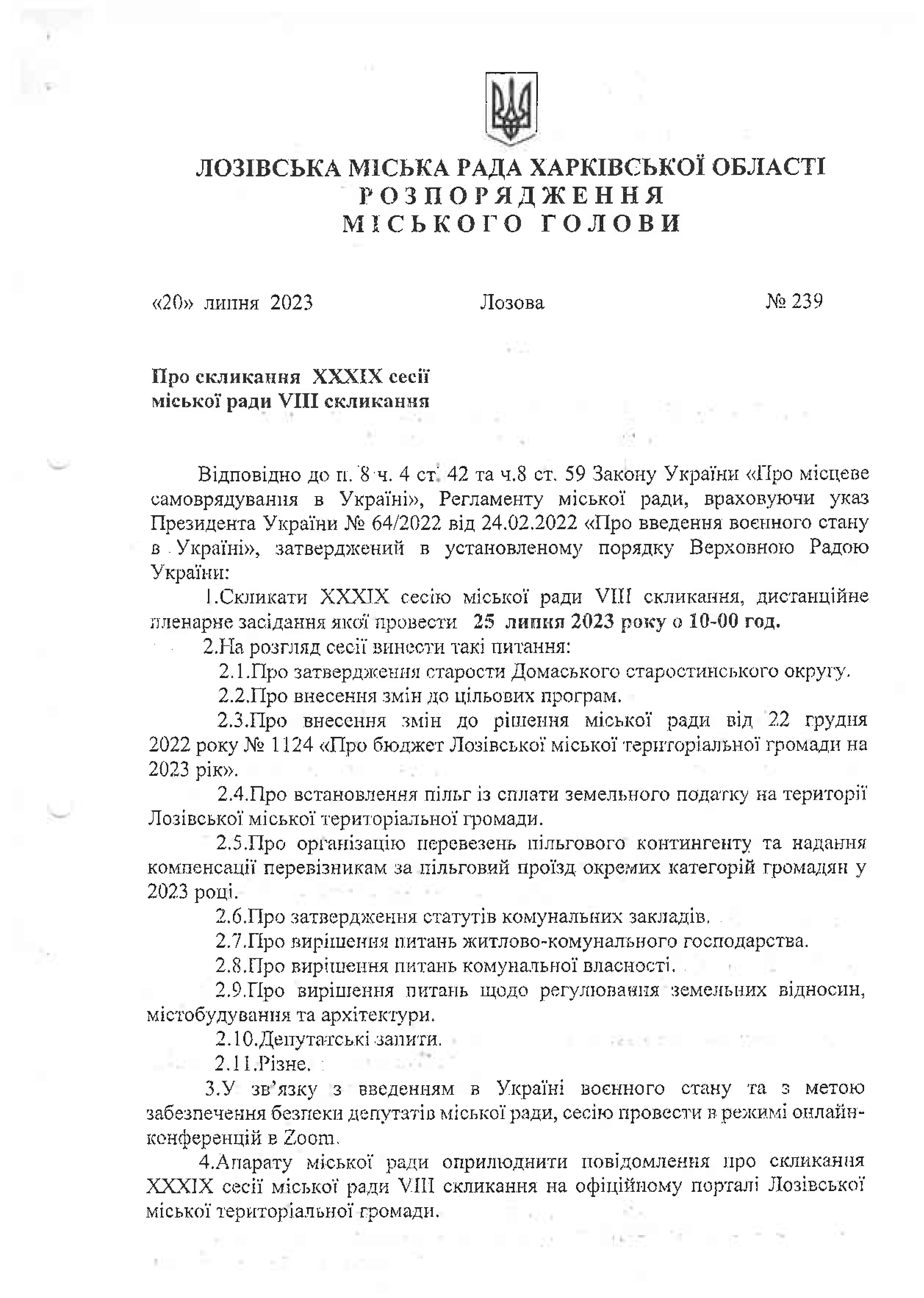 Оголошення про скликання LХХIХ сесії міської ради VIII скликання