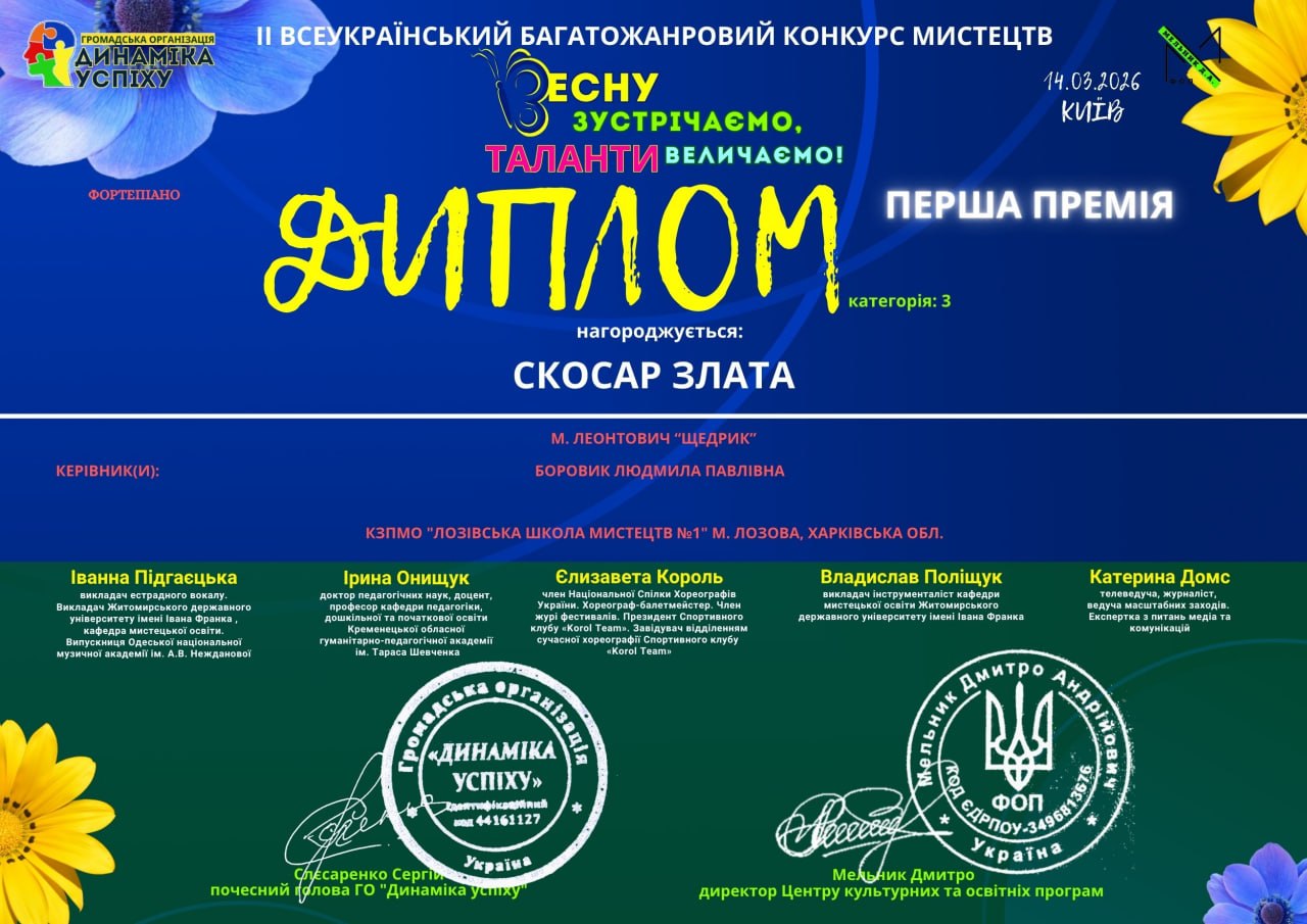 Гідно представила Лозівську громаду учениця Лозівської школи мистецтв №1 Скосар Злата. Своїм виступом вона підкорила журі, виконавши всесвітньо відомий твір «Щедрик» Миколи Леонтовича.
