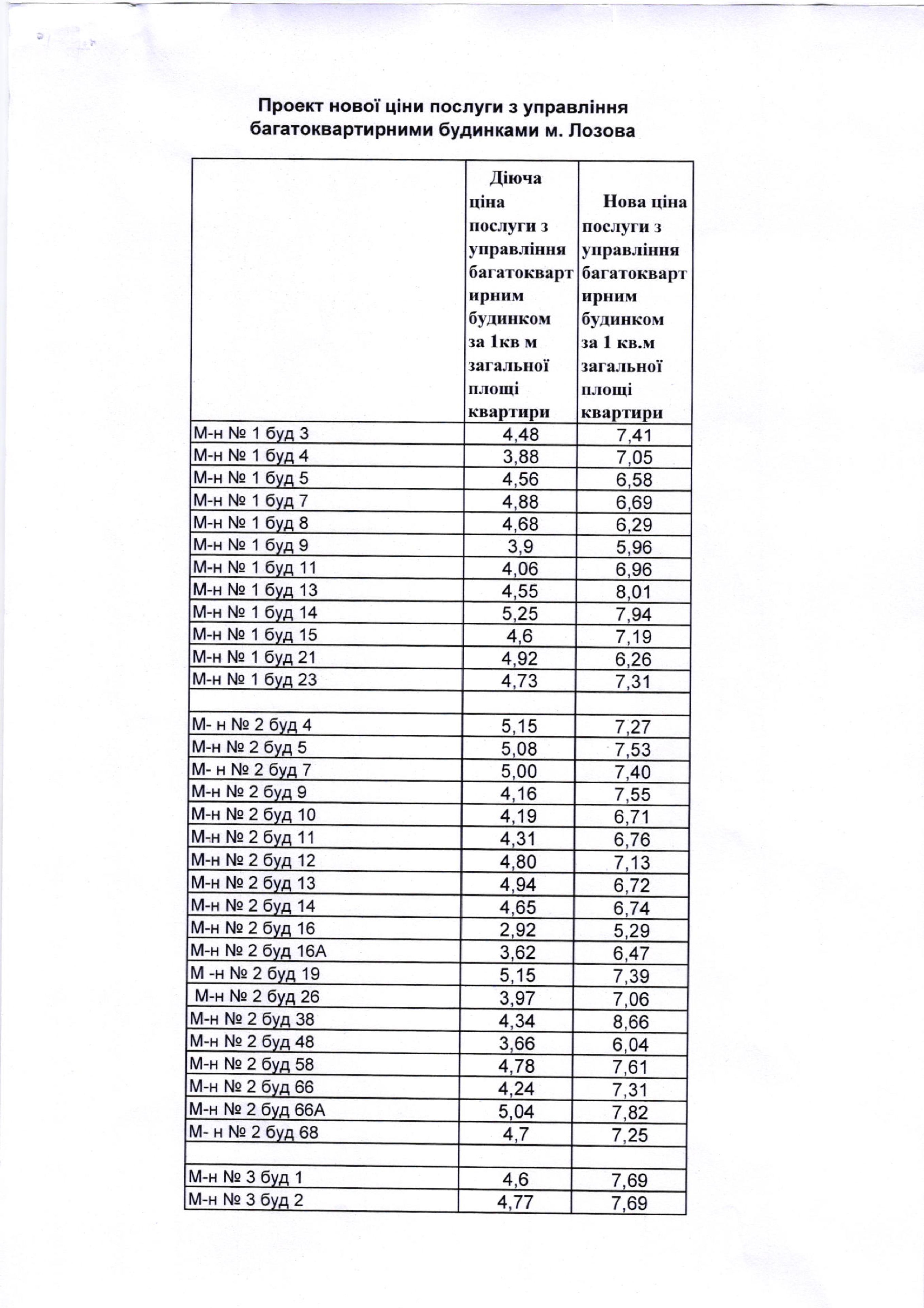 Проєкт коригування ціни послуги з управління багатоквартирними будинками з розгорнутим розрахунком