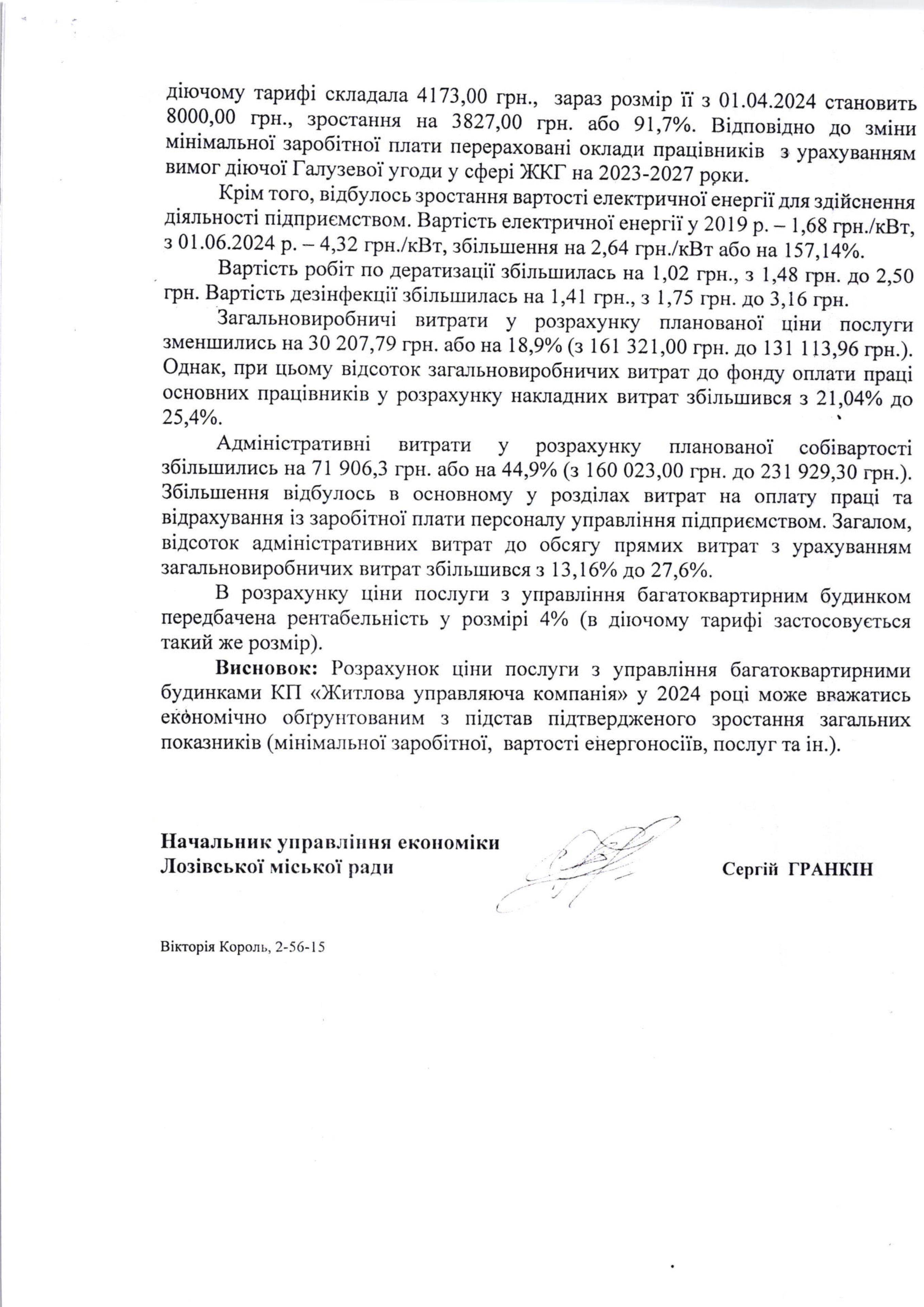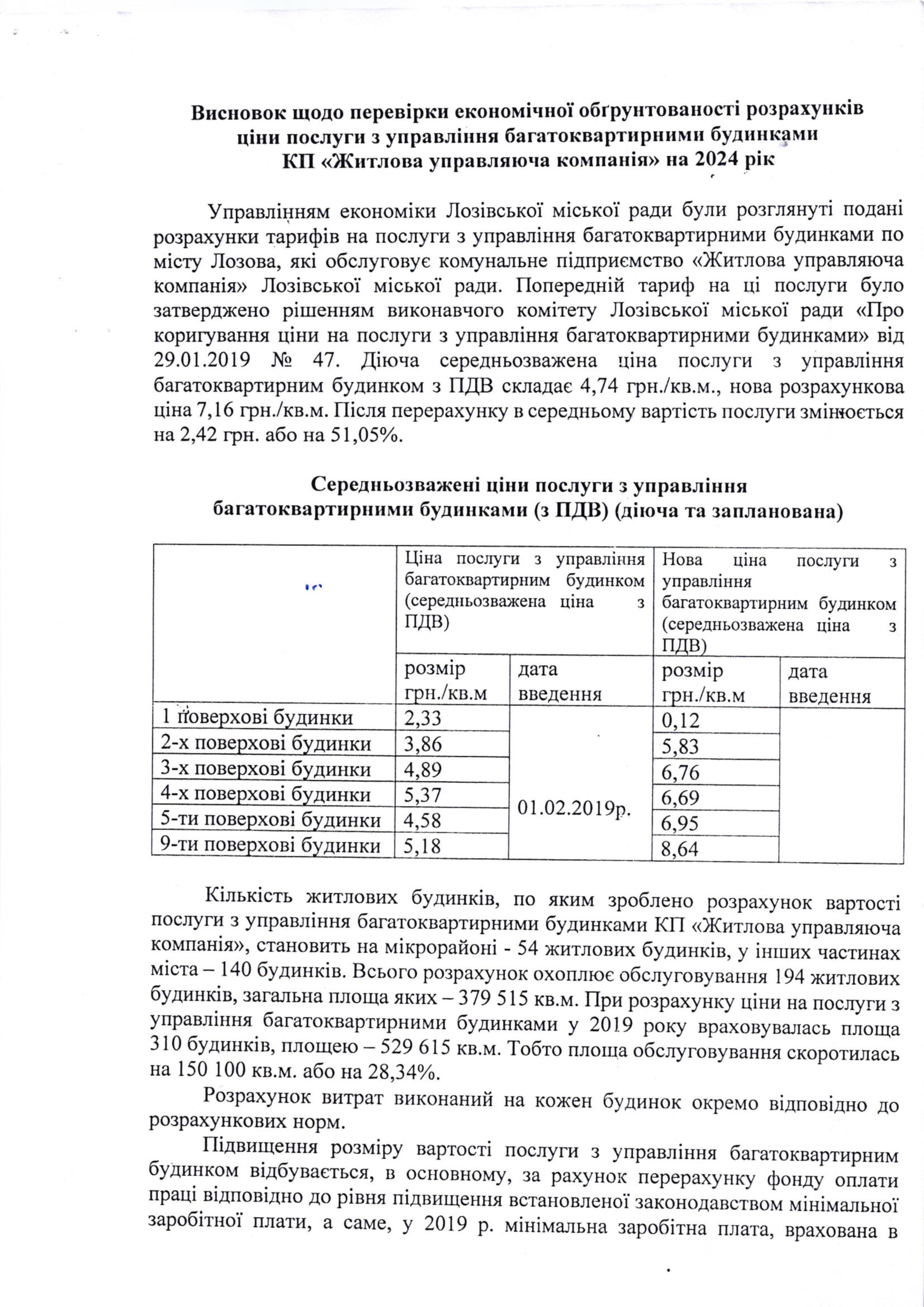 Висновок щодо перевірки економічної обґрунтованості розрахунків ціни послуги з управління багатоквартирними будинками КП «Житлова управляюча компанія» на 2024 рік