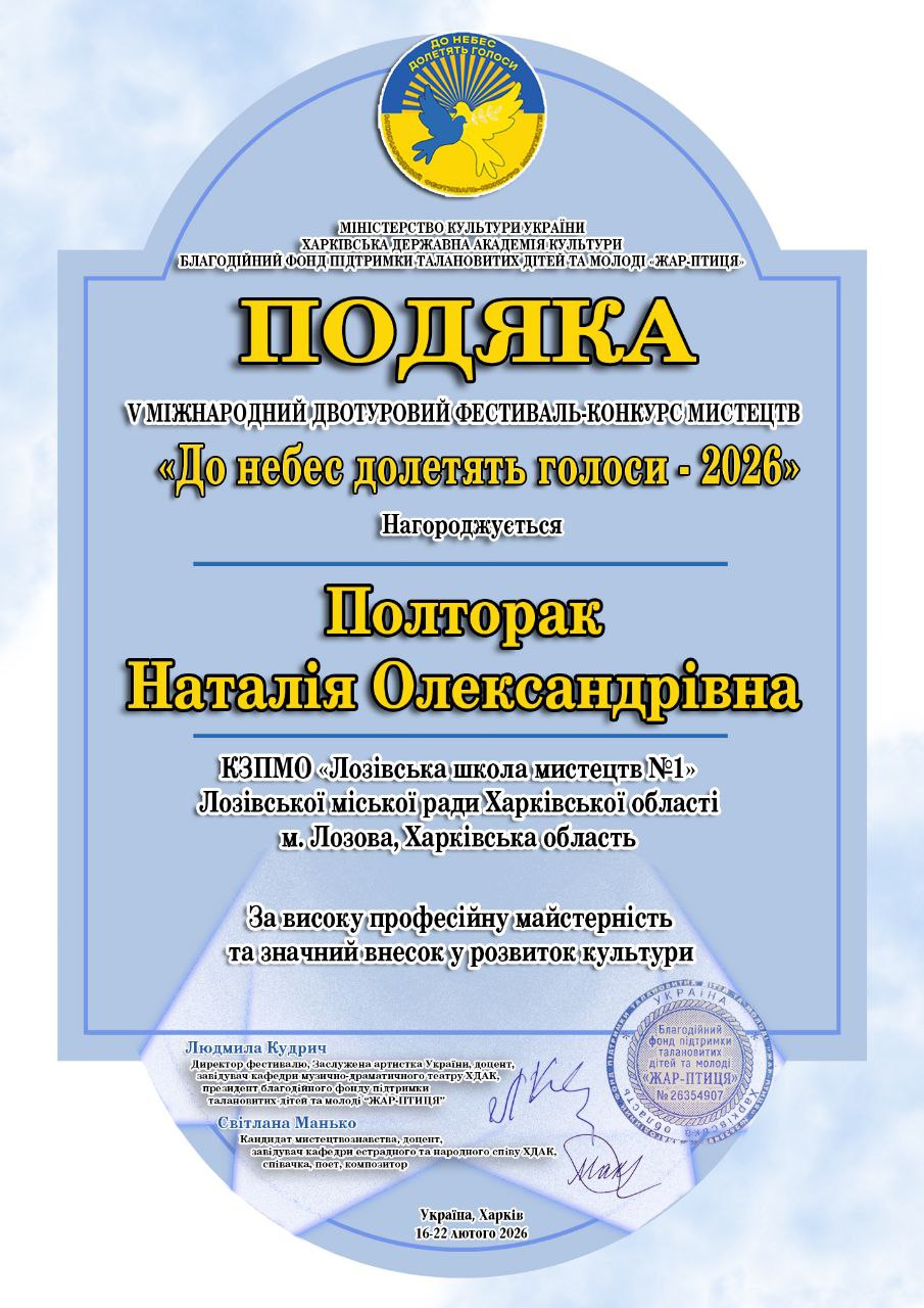 Щира подяка викладачу Полторак Наталії за професіоналізм, підтримку та внесок у розвиток юного музиканта.