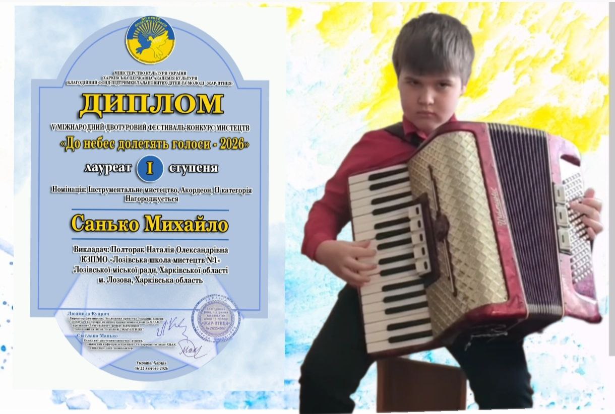 Михайло став Лауреатом І ступеня у V Міжнародному двотуровому фестивалі-конкурсі мистецтв «До небес долетять голоси-2026». Це високе визнання його таланту, наполегливої праці та системної підготовки.