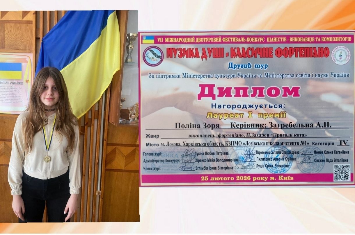 Вихованка Лозівської школи мистецтв №1, учениця 4 класу Зоря Поліна, продемонструвала високий рівень виконавської майстерності та стала Лауреатом І премії.