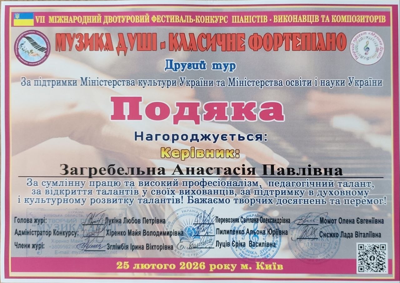 25 лютого 2026 року у місті Києві відбувся VII Міжнародний двотуровий фестиваль-конкурс піаністів-виконавців та композиторів «МУЗИКА ДУШІ — КЛАСИЧНЕ ФОРТЕПІАНО».