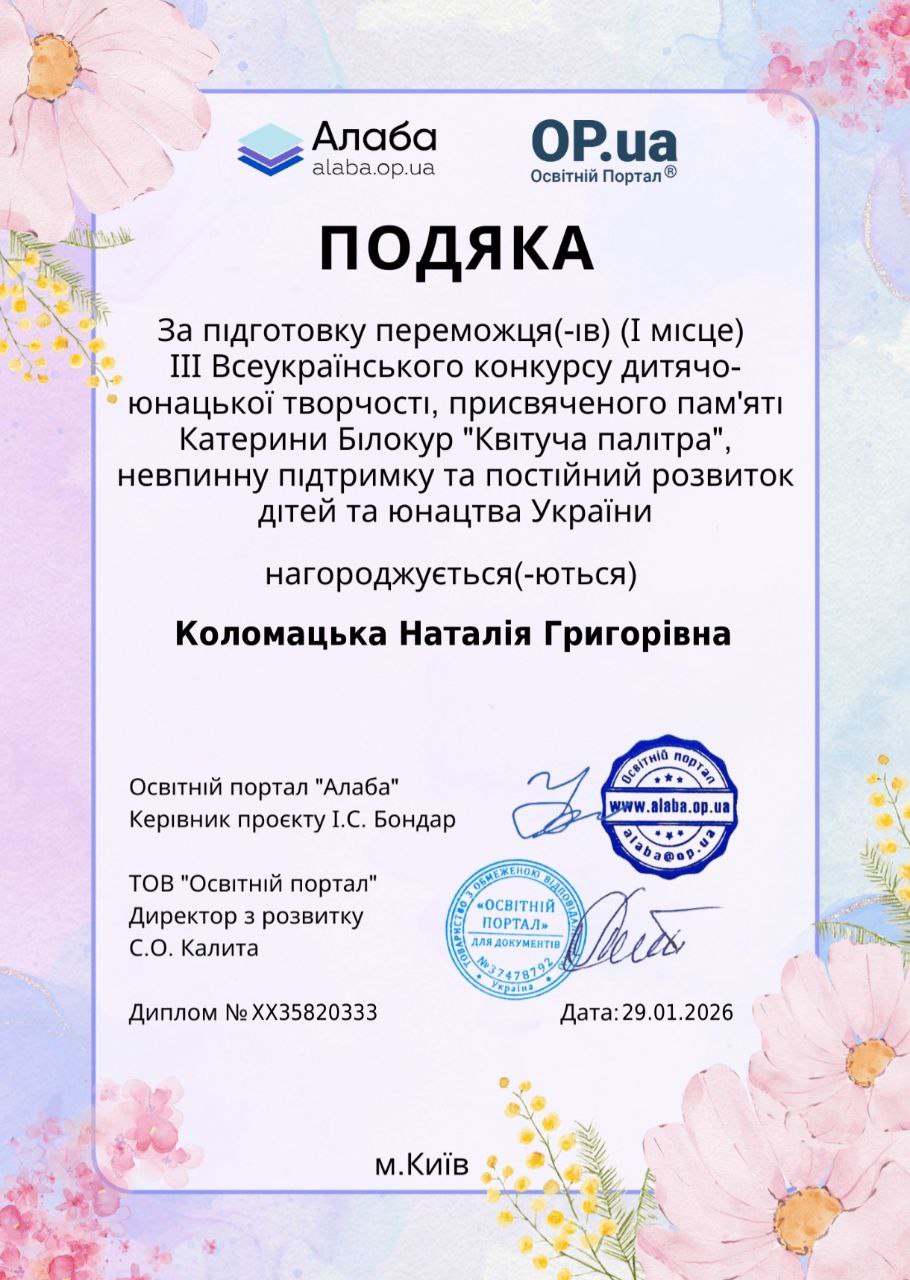 Дорогі наші художники! Ви дивитесь на світ інакше, ніж інші, і саме в цьому ваша сила. Ваша перемога — це доказ того, що щирість і творча сміливість завжди знаходять відгук у серцях людей. Пам’ятайте: кожен ваш малюнок робить цей світ трішки красивішим і добрішим.