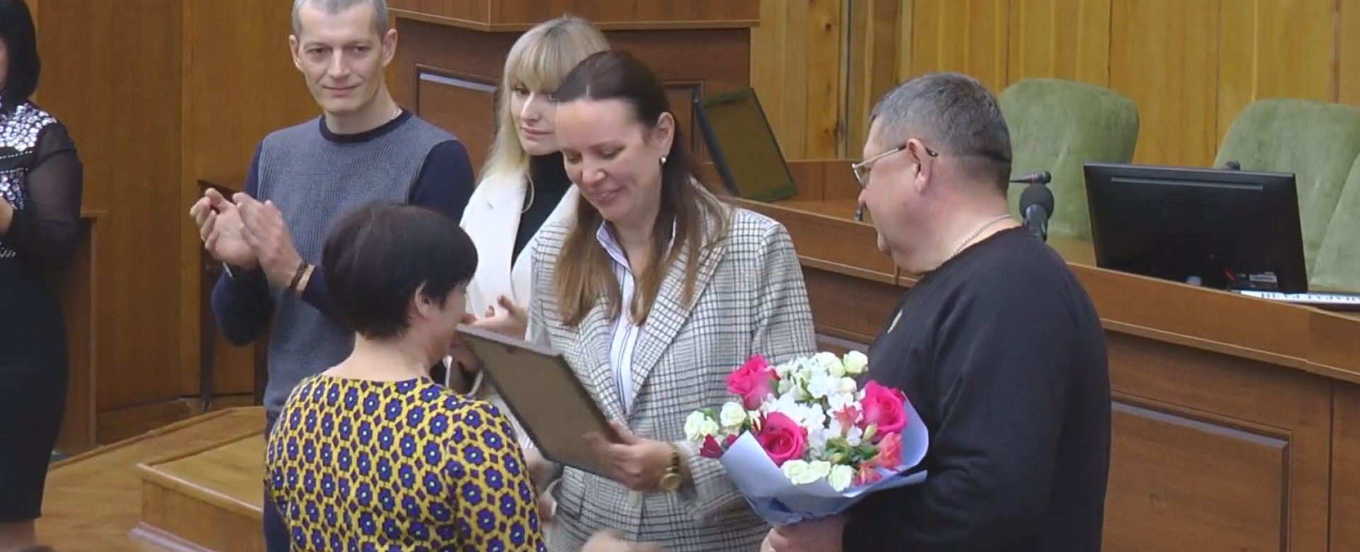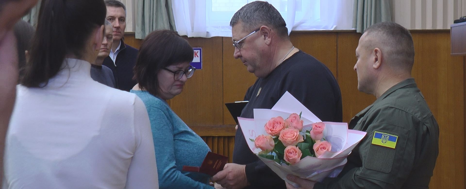 Вручили державну нагороду дружині Інні Анатоліївні та донькам Аліні і Юлії, Лозівський міський голова Сергій Зеленський та голова Лозівської військової адміністрації Володимир Ромах.