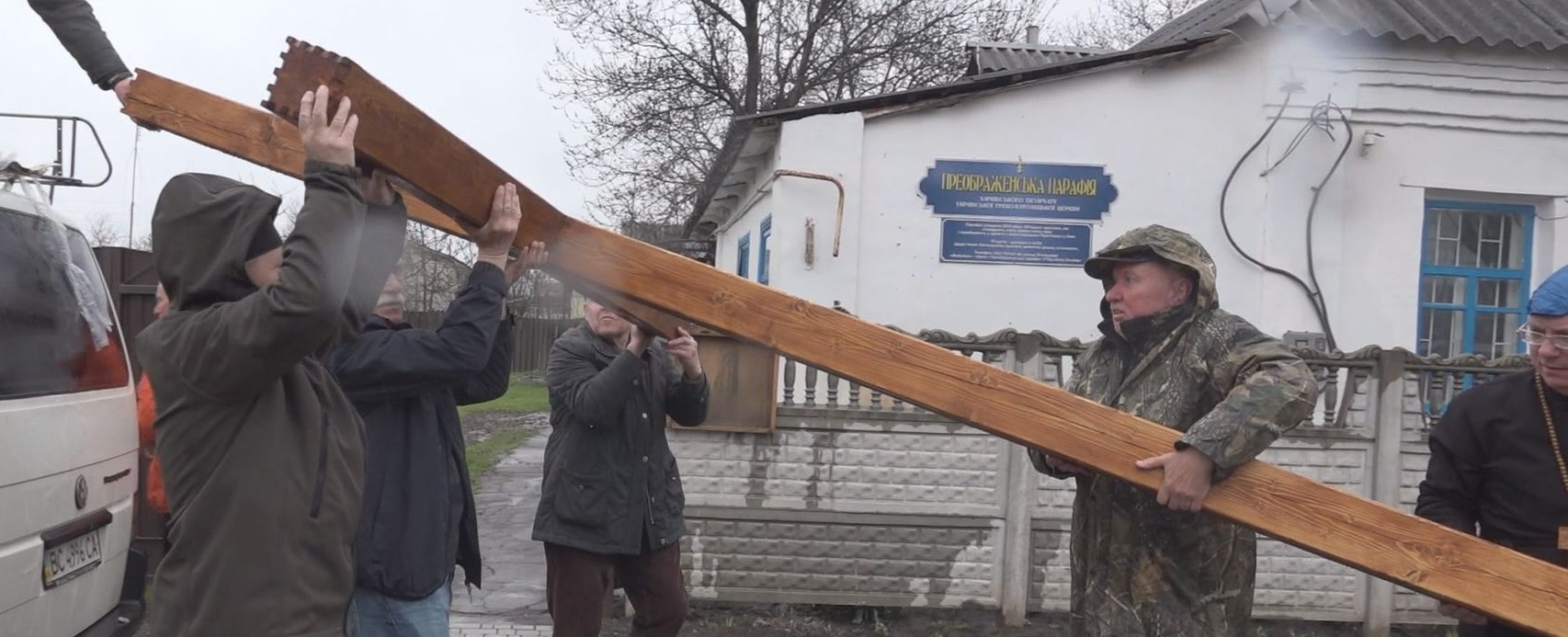 Його встановлять на місці, де планують звести храм. Дерев’яний хрест привезли учасники Хресної ходи, яку під час страсного тижня організували від Заходу до Сходу України.