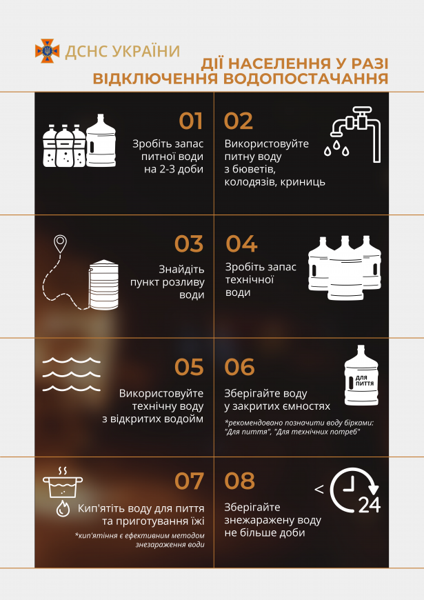 - Зберігайте воду у закритих ємностях (рекомендовано позначити воду бірками: «Для пиття», «Для технічних потреб»);